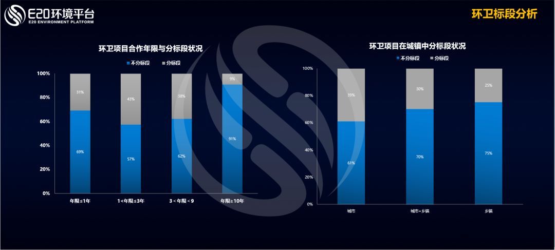 從標(biāo)段情況分析,合作年限在1~3年的項(xiàng)目分標(biāo)段的比例最高,從行政區(qū)劃來(lái)看,環(huán)衛(wèi)項(xiàng)目在城市中分標(biāo)段的比例較高。從服務(wù)內(nèi)容來(lái)看,前端的業(yè)務(wù),也就是清掃保潔的業(yè)務(wù)占82%,中端業(yè)務(wù)11%,中端加后端0.24%。