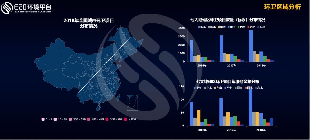 E20研究院數(shù)據(jù)中心詳細(xì)分析了七大區(qū)域中環(huán)衛(wèi)市場(chǎng)化項(xiàng)目占比,可以看出華東、華南這兩個(gè)區(qū)域占比最高。