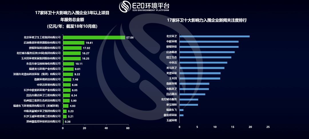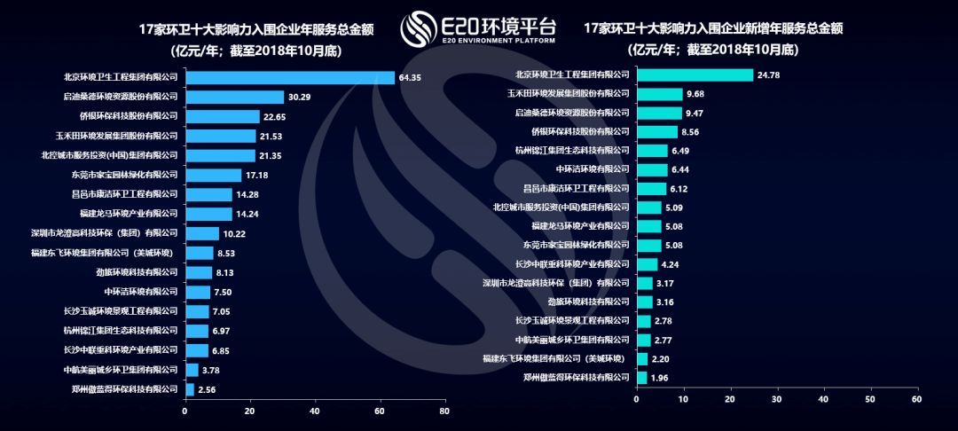 E20研究院數(shù)據(jù)中心對(duì)十大影響力入圍企業(yè)環(huán)衛(wèi)項(xiàng)目年服務(wù)金額進(jìn)行了盤點(diǎn),截至18年10月底,企業(yè)所有項(xiàng)目年服務(wù)總金額及2018年新增項(xiàng)目年服務(wù)金額排名如下圖所示: