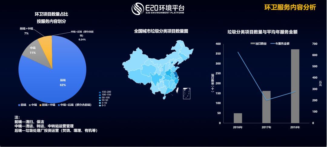 數(shù)據(jù)表明,垃圾分類的市場(chǎng)化項(xiàng)目正在逐步出現(xiàn),項(xiàng)目數(shù)量逐年走高,年服務(wù)金額大概在三百萬(wàn)左右。(相關(guān)閱讀→ 1. 【熱議】何晟:我們要怎樣的垃圾分類市場(chǎng)化?; 2. 上半年超5億項(xiàng)目落入7類企業(yè)手中,垃圾分類攪動(dòng)固廢市場(chǎng); 3. 告別小打小鬧——今年,合同金額超千萬(wàn)的垃圾分類項(xiàng)目已達(dá)8個(gè); 4. 近兩月80余個(gè)垃圾分類項(xiàng)目盤點(diǎn) 且看需求井噴背后; 5. “環(huán)衛(wèi)+X”項(xiàng)目頻出,市場(chǎng) 從“小環(huán)衛(wèi)”走向“大環(huán)衛(wèi)”)
