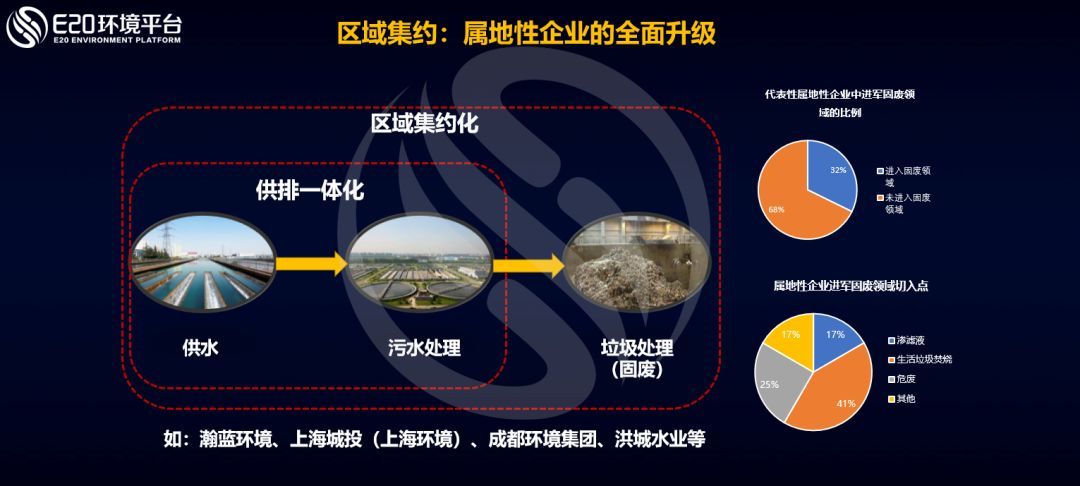 區(qū)域集約指同區(qū)域內(nèi)的管理集約,包括同要素和不同要素集約,主要實(shí)施主體是區(qū)域性環(huán)境綜合服務(wù)商(E20環(huán)境產(chǎn)業(yè)B方陣等),其屬地性、區(qū)域性強(qiáng),企業(yè)一般由當(dāng)?shù)貒?guó)資委控股,不通過(guò)競(jìng)爭(zhēng)性招標(biāo)直接承接區(qū)域內(nèi)項(xiàng)目。區(qū)域集約主要是屬地型企業(yè)的全面升級(jí),這些企業(yè)往往從供水開(kāi)始,逐步進(jìn)入污水處理,再進(jìn)入垃圾處理行業(yè)。
