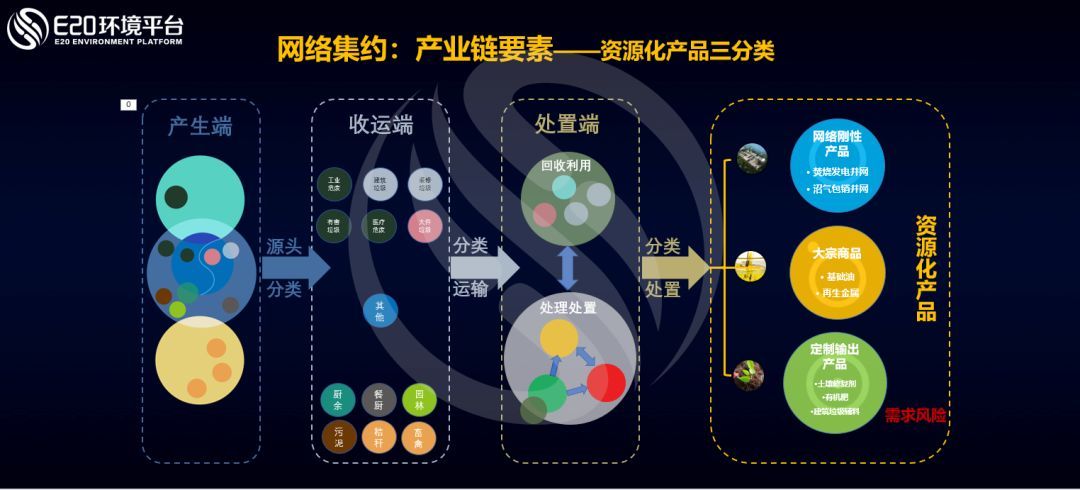 上圖對(duì)城市各種固廢的網(wǎng)絡(luò)集約進(jìn)行了總結(jié),其中廢物實(shí)現(xiàn)資源化的模式我們進(jìn)行了分類,可分為網(wǎng)絡(luò)剛性產(chǎn)品、大宗產(chǎn)品以及定制輸出產(chǎn)品。網(wǎng)絡(luò)剛性產(chǎn)品包括焚燒發(fā)電并網(wǎng),沼氣包銷并網(wǎng);大宗產(chǎn)品包括基礎(chǔ)油,再生金屬等;定制輸出產(chǎn)品包括土壤修復(fù)劑,有機(jī)肥,建筑垃圾輔料等。其中,對(duì)于網(wǎng)絡(luò)剛性產(chǎn)品和大宗產(chǎn)品,都不太用考慮后端消納的痛點(diǎn)(即不需要面對(duì)資源化產(chǎn)品銷售的需求風(fēng)險(xiǎn)),然而定制輸出類產(chǎn)品則在這個(gè)方面成為痛點(diǎn),也是屬于網(wǎng)絡(luò)集約所提供的可持續(xù)開(kāi)發(fā)和差異化競(jìng)爭(zhēng)的市場(chǎng)機(jī)會(huì)。