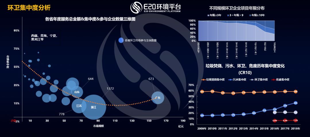 上圖顯示,環(huán)衛(wèi)集中度呈現(xiàn)一個(gè)反拋物線的狀態(tài)。在每個(gè)省來(lái)看,當(dāng)環(huán)衛(wèi)市場(chǎng)化項(xiàng)目剛剛出現(xiàn)的時(shí)候,大概只有一兩家、兩三家企業(yè)去參與,或者少數(shù)企業(yè)來(lái)參與。市場(chǎng)發(fā)展到一定程度,例如圖中浙江省,開(kāi)始出現(xiàn)大量項(xiàng)目的時(shí)候,集中度會(huì)下降,比如浙江有1372家環(huán)衛(wèi)企業(yè)。而隨著市場(chǎng)化的推進(jìn),市場(chǎng)規(guī)模進(jìn)一步擴(kuò)大之后,寡頭壟斷開(kāi)始逐步出現(xiàn),行業(yè)集中度出現(xiàn)上揚(yáng),大企業(yè)龍頭效應(yīng)出現(xiàn)。比如廣東作為市場(chǎng)規(guī)模最大的省份,其參與主體開(kāi)始減少,集中度會(huì)上揚(yáng)。對(duì)不同年限項(xiàng)目的歸屬進(jìn)行分析來(lái)看,環(huán)衛(wèi)行業(yè)雖然小企業(yè)很多,但是10年以上大體量大項(xiàng)目大都被大型企業(yè)握在手中。(相關(guān)鏈接→ 啟迪桑德年報(bào)看點(diǎn):環(huán)衛(wèi)業(yè)務(wù)漲125%,圍繞環(huán)衛(wèi)及物流買買買)