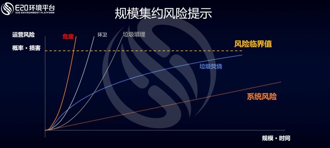 在對(duì)環(huán)境細(xì)分領(lǐng)域的規(guī)模集約介紹后,通過(guò)這張二維分析圖對(duì)各行業(yè)的規(guī)模集約進(jìn)行總結(jié)。此圖橫軸為規(guī)模及時(shí)間兩個(gè)要素 ,縱軸為運(yùn)營(yíng)風(fēng)險(xiǎn)的概率及損害。危廢行業(yè)因?yàn)檫\(yùn)營(yíng)風(fēng)險(xiǎn)大,且隨著規(guī)?;驎r(shí)間累計(jì)還會(huì)繼續(xù)上升,造成的損害也最大,因此斜率最高。而在環(huán)衛(wèi)行業(yè)中,規(guī)模越大,涉及員工越多,管理越容易出現(xiàn)問(wèn)題。垃圾填埋行業(yè)也隨著規(guī)模的增加和時(shí)間的延長(zhǎng),面臨越來(lái)越高的風(fēng)險(xiǎn)提示,反倒是垃圾焚燒行業(yè),在規(guī)范化的管理及運(yùn)營(yíng)下,相對(duì)更有機(jī)會(huì)將運(yùn)營(yíng)風(fēng)險(xiǎn)控制在可控范圍內(nèi)。當(dāng)然,要想控制風(fēng)險(xiǎn),除了自身努力,也離不開(kāi)本次論壇發(fā)言的以及其他的優(yōu)秀的技術(shù)供應(yīng)商和他們的生態(tài)合作。我們上榜的優(yōu)秀技術(shù)和裝備提供商榜單請(qǐng)參見(jiàn)→ 【年度大榜】2018固廢&環(huán)衛(wèi)企業(yè)業(yè)績(jī)榜及影響力企業(yè)出爐。