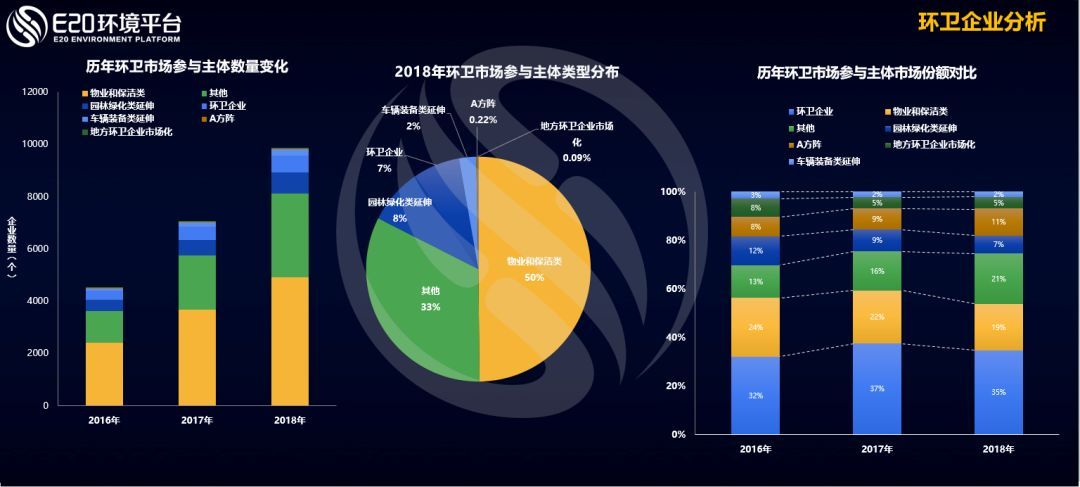 從環(huán)衛(wèi)市場(chǎng)參與主體來(lái)看,根據(jù)E20環(huán)境平臺(tái)E標(biāo)通統(tǒng)計(jì)顯示,近三年來(lái),參與環(huán)衛(wèi)市場(chǎng)化項(xiàng)目爭(zhēng)奪的環(huán)衛(wèi)企業(yè)從五千家漲到了一萬(wàn)家,參與主體大幅擴(kuò)增導(dǎo)致行業(yè)集中度未出現(xiàn)增長(zhǎng)。(相關(guān)鏈接→ 5000+企業(yè)進(jìn)軍環(huán)衛(wèi)市場(chǎng) 環(huán)衛(wèi)一體化讓企業(yè)“腦洞”大開(kāi))E20研究院數(shù)據(jù)中心對(duì)環(huán)衛(wèi)企業(yè)進(jìn)行了企業(yè)原有業(yè)務(wù)來(lái)源分析可以看出,從事物業(yè)保潔、園林綠化等多種企業(yè)紛紛布局環(huán)衛(wèi)業(yè)務(wù)。在上圖右側(cè)特別值得注意的是:來(lái)自垃圾焚燒A方陣的部分投資運(yùn)營(yíng)企業(yè)已進(jìn)入環(huán)衛(wèi),在前年8%的市場(chǎng)規(guī)模占比,在今年已經(jīng)上漲到11%,在進(jìn)入企業(yè)大擴(kuò)容的基礎(chǔ)上其份額反而逆勢(shì)穩(wěn)健提高,說(shuō)明我們這些垃圾焚燒影響力企業(yè)的市場(chǎng)沖擊力何等之大。
