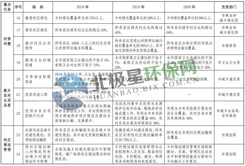 (一)推進農(nóng)村垃圾綜合治理。在實現(xiàn)城鄉(xiāng)環(huán)衛(wèi)一體化全覆蓋的基礎(chǔ)上,推行農(nóng)村生活垃圾收運處理市場化運作、減量化處理、資源化利用、數(shù)字化管理、法制化保障的工作機制,所有村莊實現(xiàn)農(nóng)村生活垃圾無害化處理。