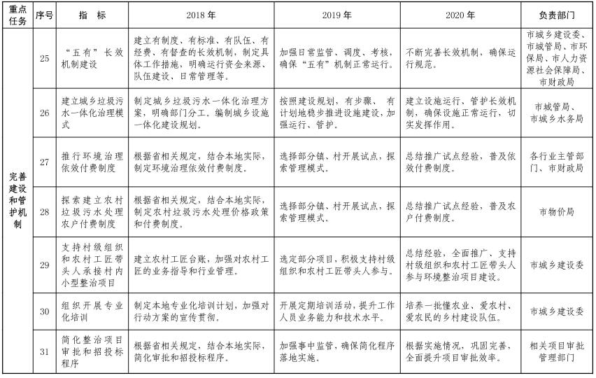 (七)完善建設(shè)和管護機制。明確各級黨委政府和有關(guān)部門、運行管理單位責(zé)任以及運行資金來源,穩(wěn)定運行隊伍,建立日常管理制度,初步構(gòu)建有制度、有標準、有隊伍、有經(jīng)費、有督查的村莊人居環(huán)境管護長效機制。
