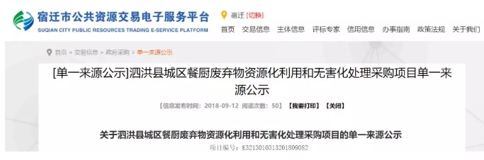 目前(宿城管發(fā)(2018)24號(hào))文件要求,全市餐廚廢棄物處理(PPP)項(xiàng)目已由中國(guó)光大國(guó)際有限公司中標(biāo)承建,其中二期工程2019年后才能覆蓋到我縣,針對(duì)我縣餐廚現(xiàn)狀及城管局核算,運(yùn)送到市里統(tǒng)一處理成本低(與市區(qū)同價(jià))操作可行。該公司具有該項(xiàng)目環(huán)??萍汲晒b定證書(shū),且省市領(lǐng)導(dǎo)均建議由該公司統(tǒng)一處理全市餐廚廢棄物。故我縣餐廚廢棄物送中國(guó)光大國(guó)際有限公司(光大環(huán)保餐廚處理宿遷有限公司)處理,符合單一來(lái)源要求。