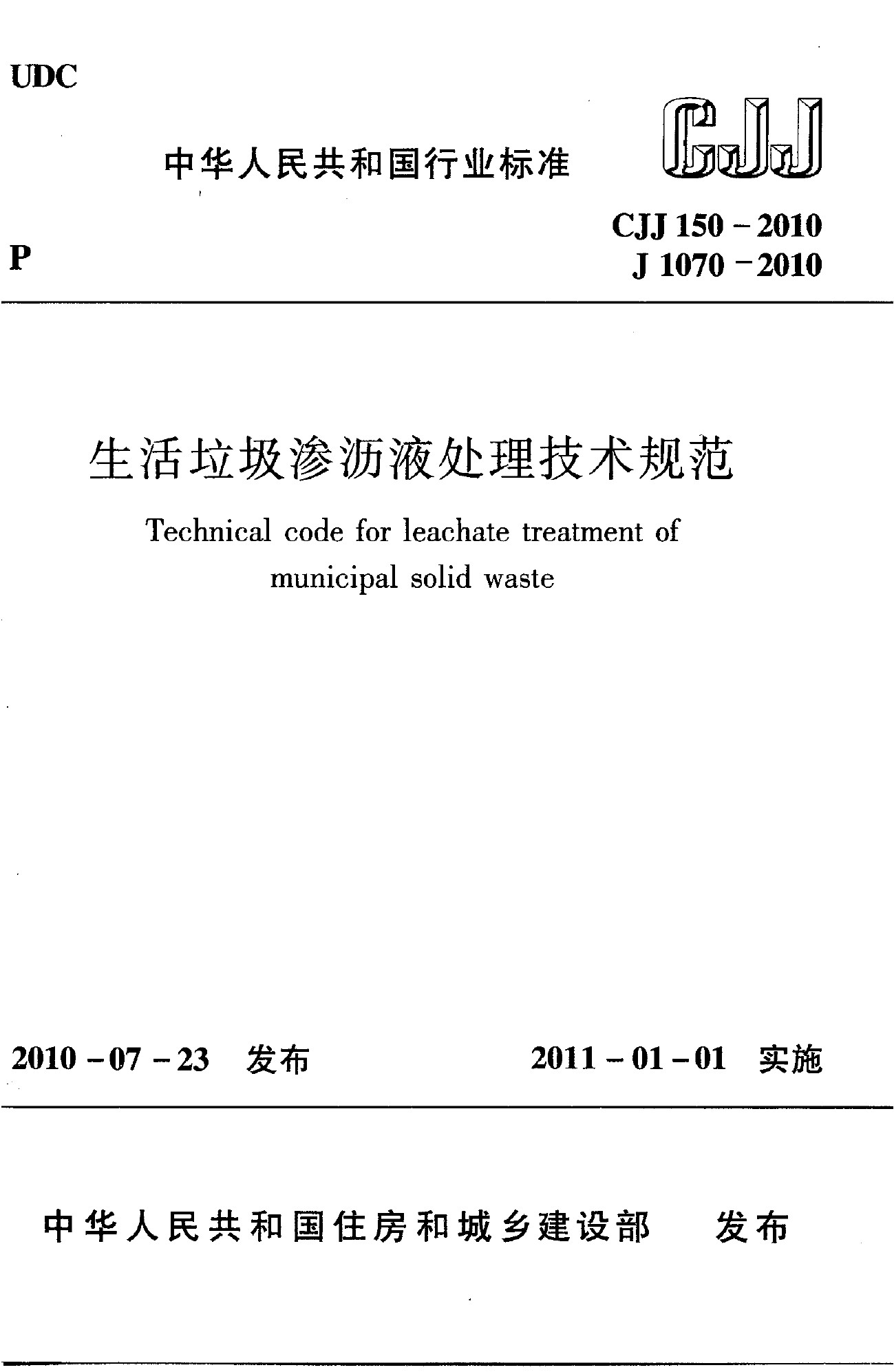 生活垃圾滲瀝液處理技術(shù)規(guī)范(CJJ 150-2010)