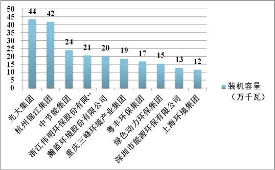 當(dāng)前我國垃圾焚燒發(fā)電行業(yè)市場競爭主體主要為大型國資背景企業(yè)和優(yōu)秀民營企業(yè)。2016年裝機容量排名前10名的垃圾焚燒發(fā)電投資企業(yè)依次為中國光大國際有限公司(43.53萬千瓦)、杭州錦江集團(41.9萬千瓦)、中國節(jié)能集團(24.1萬千瓦)、浙江偉明環(huán)保股份有限公司(20.55萬千瓦)、瀚藍環(huán)境股份有限公司(20萬千瓦)、重慶三峰環(huán)境產(chǎn)業(yè)集團有限公司(18.6萬千瓦)、粵豐環(huán)保集團(16.8萬千瓦)、綠色動力環(huán)保集團股份有限公司(15.45萬千瓦)、深圳市能源環(huán)保有限公司(12.85千瓦)、上海環(huán)境集團(11.7萬千瓦)和北京控股有限公司(11.55萬千瓦),具體詳見圖6。