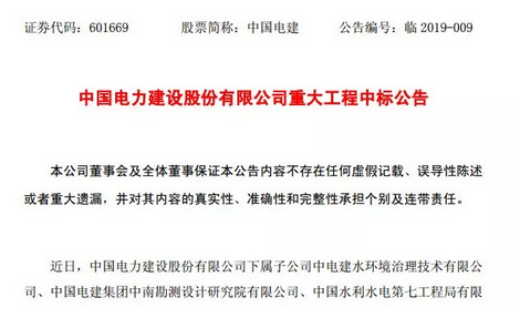 2019年1月24日,中國電建發(fā)布公告表示,中國電建水環(huán)境治理技術有限公司中標了2019年龍崗區(qū)龍崗河流域、觀瀾河流域消除黑臭及河流水質保障工程項目,中標金額約為97.31億元人民幣,項目總工期為334天。