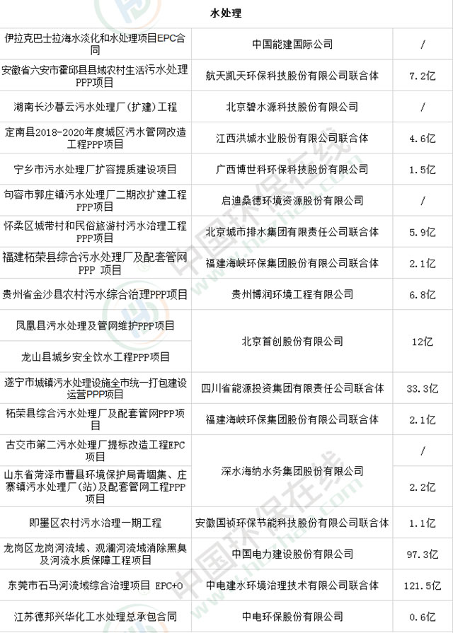 中標(biāo)項目的大頭非水處理莫屬,更值得注意的是,中標(biāo)金額普遍較大,更有33億的遂寧市城鎮(zhèn)污水處理設(shè)施全市統(tǒng)一打包建設(shè)運營PPP項目、97億的龍崗區(qū)龍崗河流域、觀瀾河流域消除黑臭及河流水質(zhì)保障工程項目、121億的東莞市石馬河流域綜合治理項目 EPC+O,振奮人心。