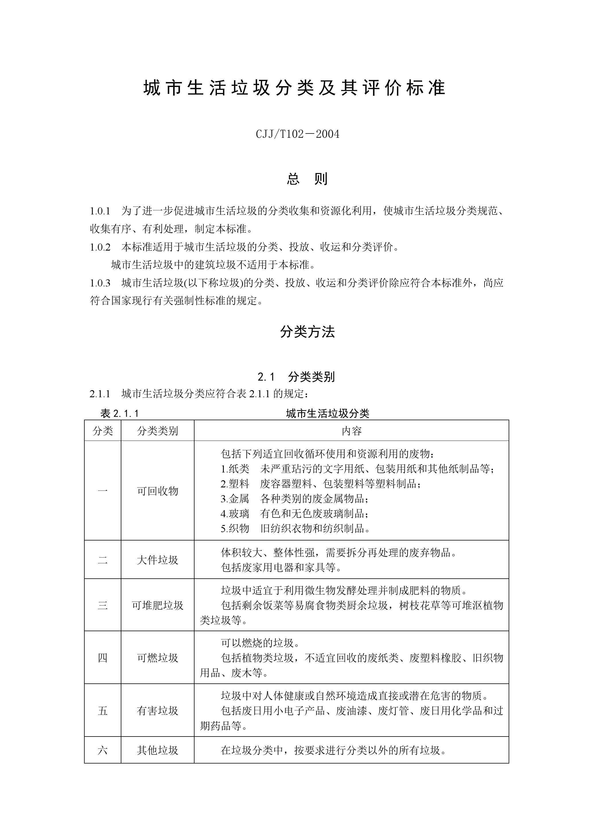 城市生活垃圾分類及其評價標準(CJJ/T102-2004)