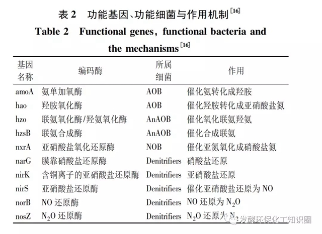 部分亞硝化-厭氧氨氧化過(guò)程主要依賴于AOB與AnAOB,其中功能細(xì)菌、功能基因及作用原理如表2所示,除AOB和AnAOB功能基因以外,還列出了NOB和反硝化細(xì)菌的功能基因。在部分亞硝化-厭氧氨氧化反應(yīng)過(guò)程中需要調(diào)控菌群結(jié)構(gòu),促進(jìn)AOB和AnAOB占優(yōu)勢(shì),其調(diào)控方法在第2、3部分進(jìn)行討論。
