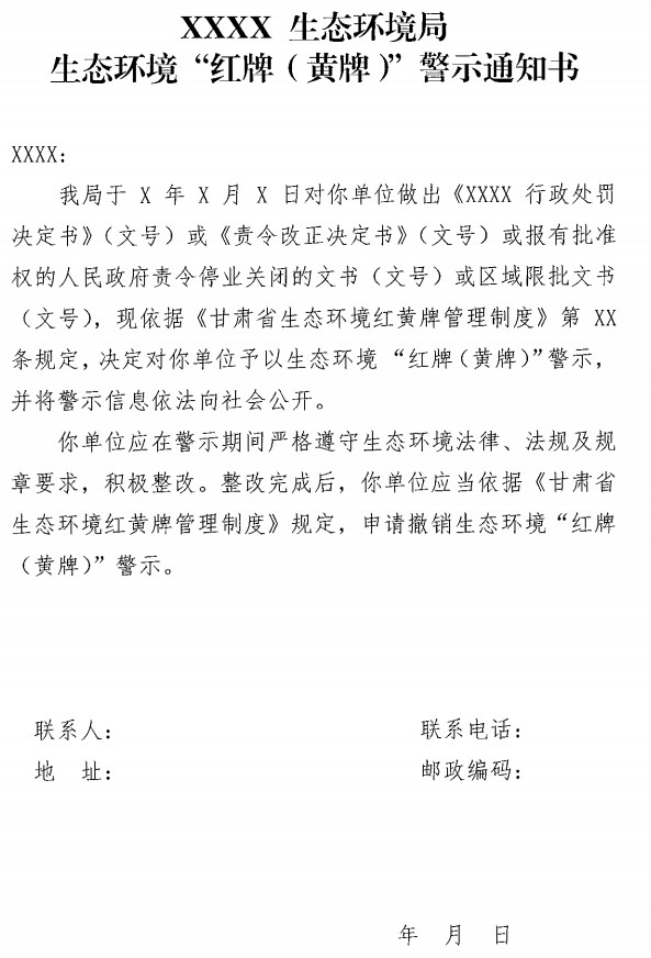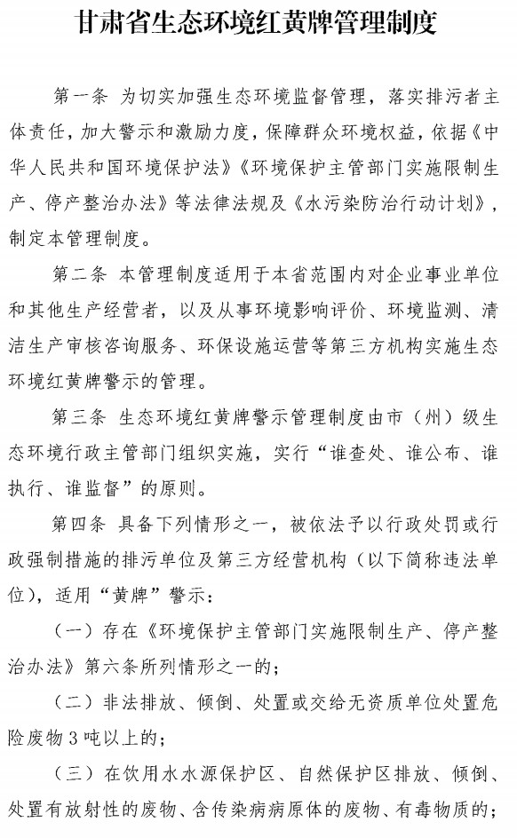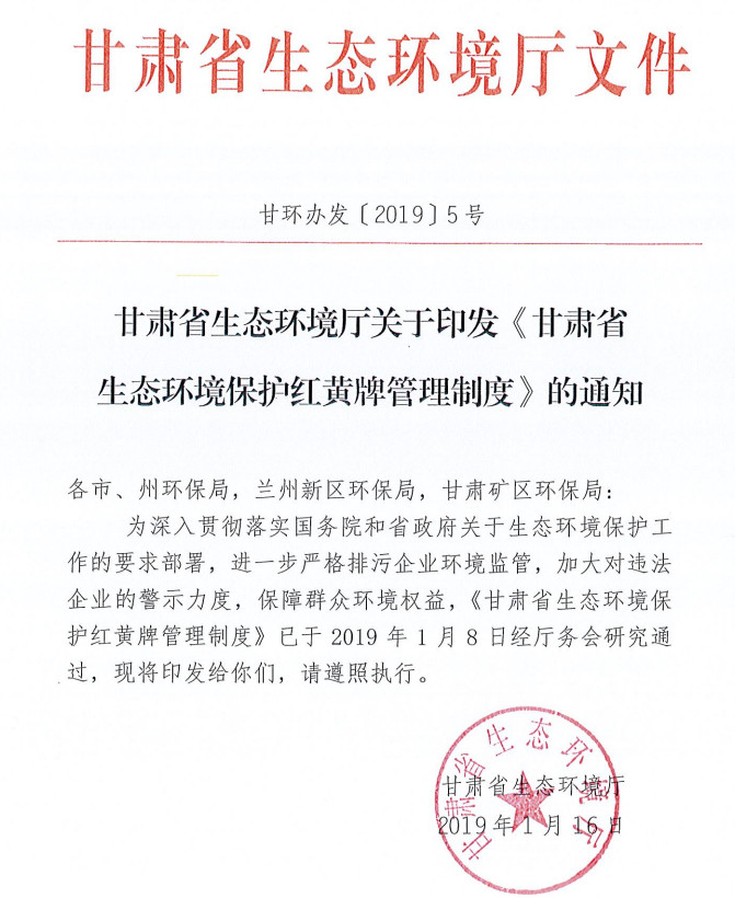 近日,甘肅省生態(tài)環(huán)境廳發(fā)布了甘肅省生態(tài)保護紅黃牌管理制度的通知,重點大氣污染物或水污染物,超過總量控制指標50%以上的將受黃牌警示,第三方環(huán)境監(jiān)測數(shù)據(jù)造假將受紅牌警示,全文如下: