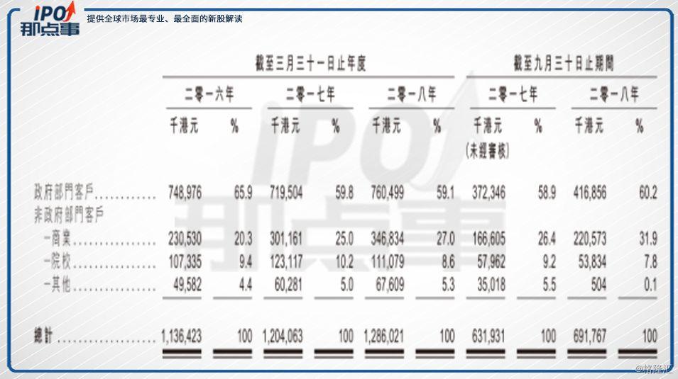 客戶方面,公司主要為政府及非政府部門客戶兩大類。其中,公司的主要業(yè)務收入是來自政府部門客戶,自2016年至2018年三季度,該部分收入分別約為7.49億港元、7.195億港元、7.605億港元及4.169億港元,相當于相應期間總收入的約65.9%、59.8%、59.1%及60.2%。