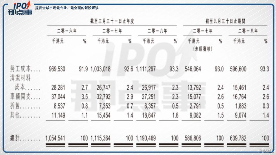 三是勞動密集型企業(yè),弊端較明顯。目前公司有逾8000名雇員,其中大部分為營運部門的前線工人,因此勞工成本(主要包括薪金及其他勞工福利、強積金供款、雇員福利撥備及人力資源供應商成本)是公司服務成本的最大部分,長期占據(jù)總成本90%以上比例,2018年中期的勞工成本甚至高達93.3%。