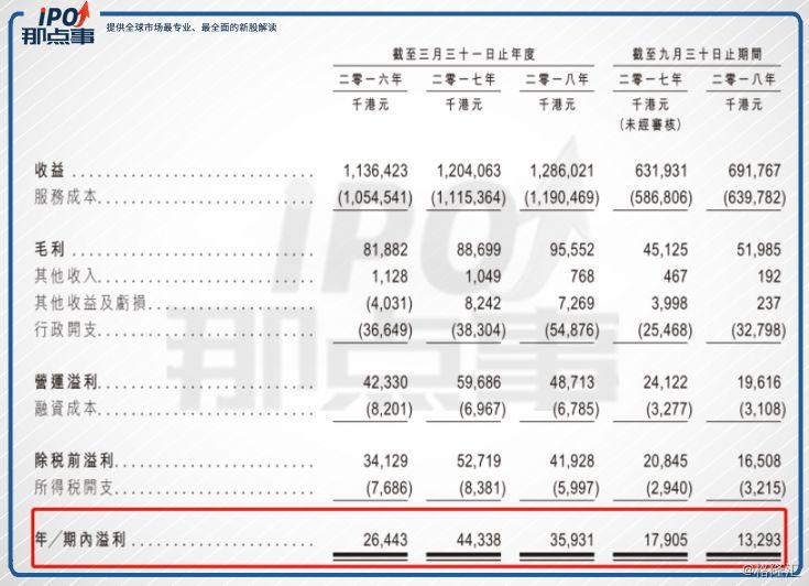 根據(jù)招股書數(shù)據(jù),公司的近3年度及2018年中期的收入分別約為11.364億港元、12.041億港元、12.86億港元及6.918億港元。于相應年度╱期間,毛利分別約為8190萬港元、8870萬港元、9560萬港元及5200萬港元。