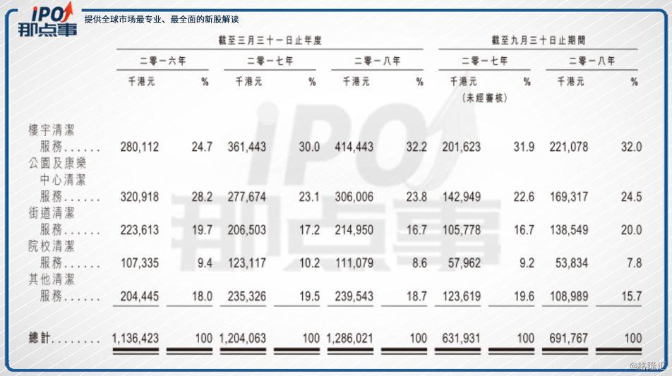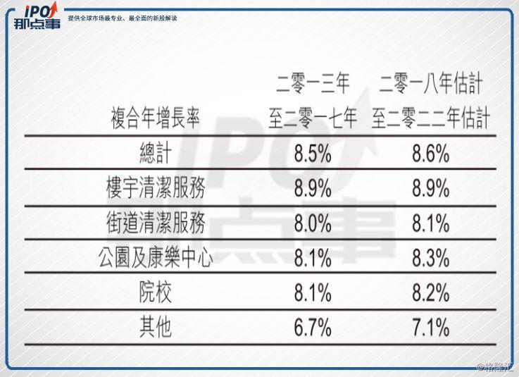 根據(jù)招股書資料,香港的環(huán)衛(wèi)服務市場從2013年的103.84億港元增長至2017年的143.84億港元,復合年增長率8.5%,未來預測也將按復合年增長率8.6%增長,樓宇清潔服務占香港環(huán)境衛(wèi)生服務市場最大份額,但復合年增長率也只有8.9%,其他同類業(yè)務也大概在此區(qū)間。