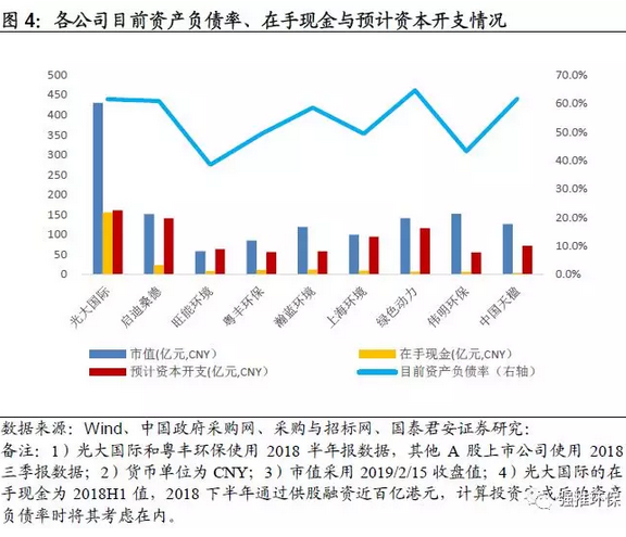 預(yù)計的資本開支完成之后資產(chǎn)負(fù)債率的計算方法:1)根據(jù)各公司目前的資產(chǎn)負(fù)債率和在手現(xiàn)金情況,假設(shè)不進(jìn)行新的股權(quán)融資,所有在手現(xiàn)金都投入新項目建設(shè),保守按照目前我們有統(tǒng)計數(shù)據(jù)的項目的平均資本金投入為28%來計算,預(yù)計除光大國際以外的其他公司新項目所需資本金投入都大于目前在手現(xiàn)金,因此統(tǒng)一假設(shè)項目除了在手現(xiàn)金投入的部分以外,都使用銀行貸款,我們對預(yù)計資本開支完成之后,公司的資產(chǎn)負(fù)債率水平進(jìn)行測算;2)由于各公司都有部分項目已經(jīng)在建,相應(yīng)的負(fù)債已體現(xiàn)在了目前的資產(chǎn)負(fù)債表中,且在手所有項目并非在同一時間內(nèi)開始投資,因此我們的計算結(jié)果將高于實際水平。