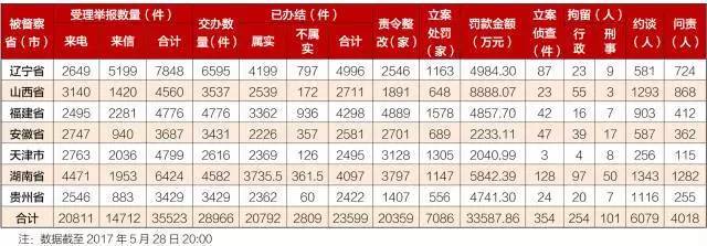4月28日至5月28日,第三批7個中央環(huán)境保護督察組共計受理舉報35523個,經梳理分析并合并重復舉報,累計向被督察地方交辦有效舉報28966件。地方已辦結23599件,責令整改20359家,立案處罰7086家,共計罰款33587.86萬元;立案偵查354件,行政和刑事拘留355人,約談6079人,問責4018人。