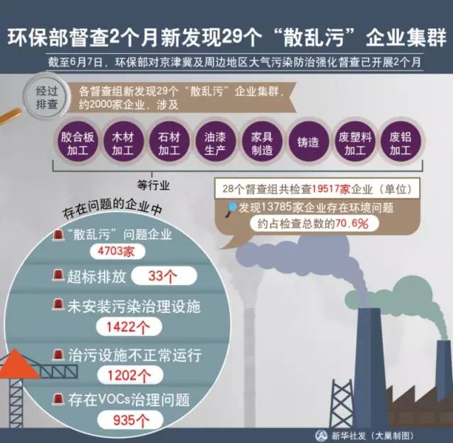 截至6月7日,京津冀及周邊地區(qū)大氣污染防治強化督查已開展2個月,從強化督查情況看,“散亂污”問題最為突出,占查出環(huán)境問題的36.6%。
