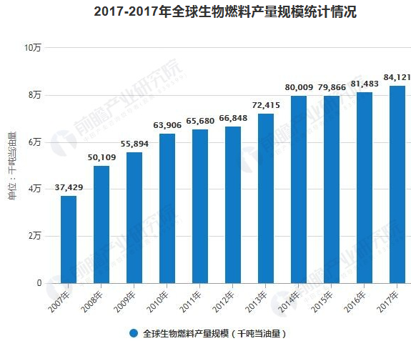 隨著全球大規(guī)模、大范圍的發(fā)展生物質(zhì)能發(fā)電,生物燃料生物燃料產(chǎn)量規(guī)模也實現(xiàn)的迅速的增長。數(shù)據(jù)顯示,2007年全球生物燃料產(chǎn)量為3742.9萬噸當油量,至2017年上升至8412.1萬噸當油量,2008-2017年復(fù)合增長率達8.43%。