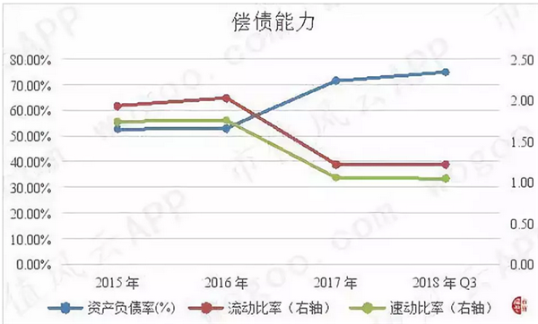 盛運環(huán)保2015年末至2018年3季度末的資產(chǎn)負(fù)債率分別為52.54%、52.80%、71.40%和74.84%,一路飆升,說明公司的償債壓力越來越大。