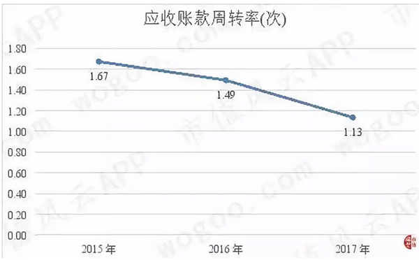 盛運環(huán)保2015年至2017年的應(yīng)收賬款周轉(zhuǎn)率分別為1.67次、1.49次和1.13次,不斷下滑,說明公司的應(yīng)收賬款管理能力在持續(xù)下降。