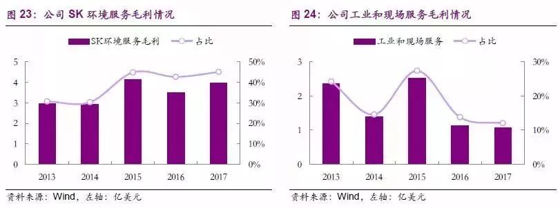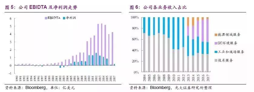 除傳統(tǒng)的技術服務之外,公司還提供SK環(huán)境及性能產(chǎn)品服務、工業(yè)和現(xiàn)場服務、以及能源領域(石油天然氣和住宿)服務三大業(yè)務,努力向“一站式服務”的服務提供商靠攏。其中,前兩種業(yè)務和傳統(tǒng)的技術服務共同構成了公司的核心增長動力,三者營業(yè)收入占比高達96%;而能源領域服務在未來有望隨著美國頁巖氣革命的發(fā)展給公司帶來新的增量。
