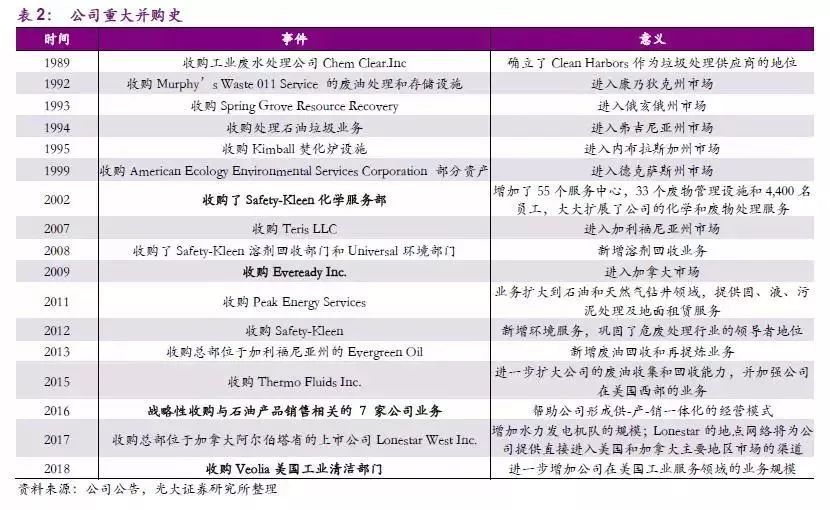 公司上在原有危廢處理技術的基礎上,通過兼并收購增添一系列新的服務領域。2008年,公司通過收購Safety-Kleen 溶劑回收部門和Universal 環(huán)境部門,開始涉足溶劑回收市場,新增大量業(yè)務。2009年,公司收購Eveready,在進軍加拿大市場的同時,擴大了公司能源和工業(yè)服務范圍。能源和工業(yè)部門為石油和天然氣勘探和生產(chǎn),煉油,石化,紙漿和造紙以及電力公用事業(yè)終端市場等提供一系列服務。此前,Clean Harbors 在這一領域的傳統(tǒng)業(yè)務相對較小,收購Eveready 將公司的能源和工業(yè)服務收入從3千萬增加到5.5~6億,使其從一個小眾玩家成長為了市場上該項業(yè)務強有力的競爭對手。2011年,公司收購 Peak Energy Services,提供固、液、污泥處理及地面租賃服務,將業(yè)務擴大到石油和天然氣鉆井領域。2012年,公司收購北美領先的廢油回收和再精煉、零件清潔及環(huán)境解決方案公司Safety-Kleen,是公司歷史上最大規(guī)模收購。對Safety-Kleen的并購使得公司成為北美最大的二手油重磨機和回收商。此次收購新增了環(huán)境服務業(yè)務,進一步鞏固了公司危廢處理行業(yè)的領導者地位。公司在2013年和2015年相繼收購了總部位于加利福尼亞州的Evergreen Oil 及 Thermo Fluids Inc.,提升公司廢油回收和再精煉能力,進一步增強業(yè)務能力。