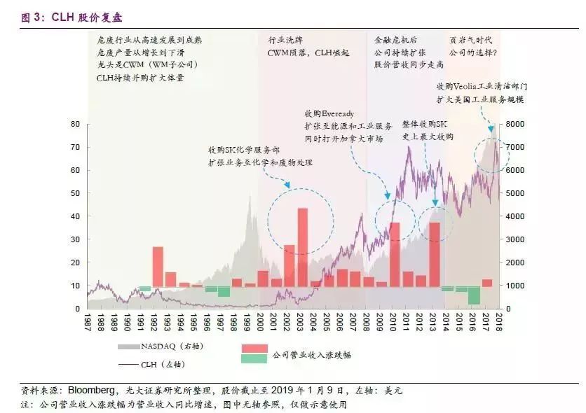 公司的發(fā)展并非一帆風順。在美國危廢行業(yè)高速發(fā)展二十世紀70 和80 年代,行業(yè)龍頭是固廢處置龍頭Waste Management 的子公司——ChemicalWaste Management(以下簡稱CWM)。Waste Management 的創(chuàng)始人DeanBuntrock 和 Wayne Huizenga 抓住了危廢行業(yè)即將興起的機遇,在1975 年把危險廢物和化學廢物的業(yè)務分離出來,成立了CWM,率先進入了危廢市場。1976年,RCRA 法案頒布后,CWM 進行了大規(guī)模的擴張,大舉購買全美的危廢設施,成為全美危廢行業(yè)的超級公司。然而1990 年后,隨著美國工業(yè)遷移,結合監(jiān)管趨嚴,美國危廢行業(yè)整體走向蕭條,CWM 作為行業(yè)龍頭受到較大沖擊,CLH 在合適的時間通過合理的并購成為新的巨頭,開啟了公司新一輪的成長。