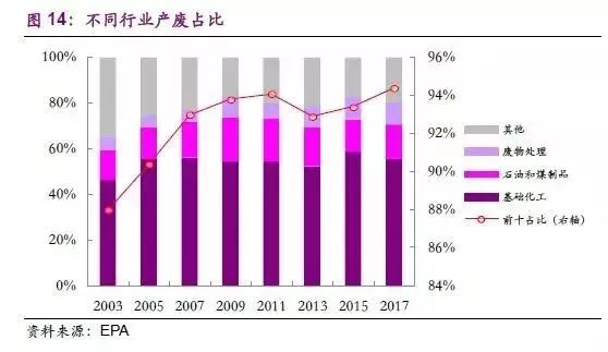 (1)危廢行業(yè)較依賴工業(yè),尤其是化工和油氣行業(yè)的發(fā)展。美國不同行業(yè)對危廢產(chǎn)量的貢獻度上,基礎化工制造業(yè)占比常年超50%,石油和煤制品制造業(yè)以及廢物處理行業(yè)也穩(wěn)居前三,且近20年來,排名前三和前十的行業(yè)的危廢產(chǎn)量占比在穩(wěn)步提高,進一步推動了行業(yè)集中度的提升。
