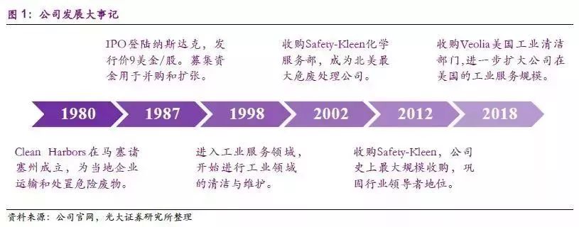 公司于1980年在馬薩諸塞州成立,1989年通過收購工業(yè)廢水處理公司Chem Clear Inc. 確立了CLH 作為垃圾處理供應商的地位。1992-1995年,公司先后收購Murphys Waste 011 Service 的廢油處理和存儲設施、SpringGrove Resource Recovery、處理石油垃圾業(yè)務、Kimball 焚化爐設施,逐步進入康乃狄克州市場、俄亥俄州市場、弗吉尼亞州市場、內(nèi)布拉斯加州市場,將公司從東海岸發(fā)展到中部。1999年和2007年,公司先后收購AmericanEcology Environmental Services Corporation 部分資產(chǎn)、Teris LLC,進入德克薩斯州市場及加利福尼亞市場,將業(yè)務拓展到西部。2009年,公司收購從事工業(yè)維護和生產(chǎn)、住宿和地震服務的加拿大公司Eveready,此次收購增加了2,100多名員工,79個地點和2400多輛卡車和拖車單元的服務車隊,將業(yè)務拓展到加拿大,公司正式進軍海外市場。此外,公司2002年收購 Safety-Kleen化學服務部,為公司增加了 55個服務中心、33個廢物管理設施、4400名員工,大大擴展了公司的化學和廢物處理服務,提升了核心競爭力。