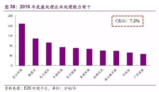 目前我國危廢市場的優(yōu)秀參與者眾多,隨著危廢處理“量價齊增”的情況延續(xù),從傳統(tǒng)危廢處理企業(yè)東江環(huán)保、光大綠色環(huán)保,到全產(chǎn)業(yè)鏈拓展的大型環(huán)保公司東方園林、北控水務,再到資金實力雄厚的新興力量海螺創(chuàng)業(yè)、雅居樂,均在危廢行業(yè)持續(xù)開疆拓土。但是,我國的危廢市場行業(yè)集中度仍相對較低。根據(jù)E20環(huán)境平臺的統(tǒng)計,雖然我國的危廢企業(yè)處理量快速增長,但是CR10的總產(chǎn)能僅占全國總產(chǎn)能的7.2%,仍有大量的危廢產(chǎn)能被小型企業(yè)所瓜分。