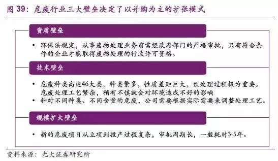 規(guī)模擴大壁壘:新的危廢項目從立項到投產(chǎn)過程復雜,審批周期長,一般耗時3-5年。顯然,收購有資質的企業(yè)會比新建產(chǎn)能更容易擴大企業(yè)規(guī)模。