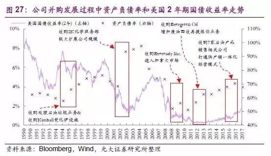 (1)內(nèi)因:發(fā)展戰(zhàn)略清晰,并購時機得當。從早期的“橫向”并購穩(wěn)步擴大公司規(guī)模,到危廢行業(yè)轉型期抓住機會并購SK 一舉做大公司體量,再到危廢成熟期的跨行業(yè)并購多元化發(fā)展穩(wěn)固公司危廢處理龍頭地位,公司在不同階段的發(fā)展戰(zhàn)略十分清晰;同時公司的幾個重要并購均處在融資成本相對合理的時期,資產(chǎn)負債率雖然在并購發(fā)生時有所提升,但后續(xù)的管控使得資產(chǎn)負債率一直處于相對平穩(wěn)水平。
