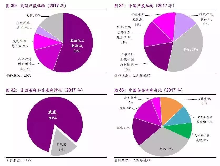 從產(chǎn)廢結構上來看,美國是石油化工生產(chǎn)大國,其產(chǎn)廢結構中基礎化工以及石油/煤制品制造業(yè)的產(chǎn)廢占比合計高達71%(2017年);由于石化企業(yè)多產(chǎn)生液態(tài)危廢,因而美國的危廢產(chǎn)量中83%為液態(tài)危廢。而我國的化工行業(yè)產(chǎn)廢僅占總量的19%,且產(chǎn)廢行業(yè)較為分散,有色金屬冶煉、非金屬礦采選、造紙等行業(yè)的產(chǎn)廢占比均超過10%。另一方面,液態(tài)危廢在國內(nèi)危廢總體結構中占比較小,以目前的廢物結構看,將廢堿(15.67%)、廢酸(14.37%)、廢油(5.36%)全看作液態(tài)危廢,合計占比僅為35%。