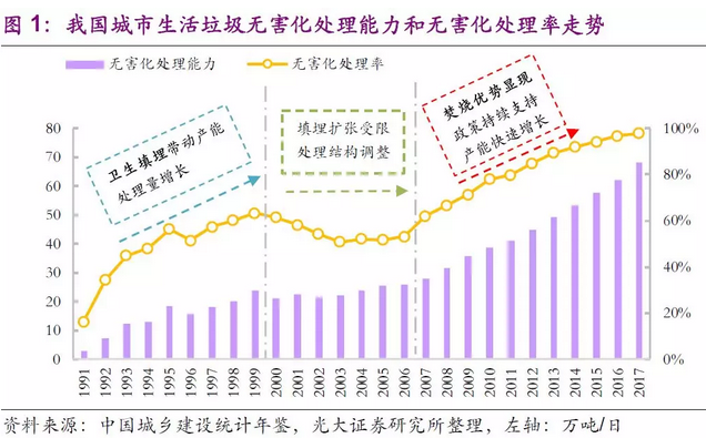 “垃圾減量化”在行業(yè)發(fā)展過程中逐漸占據(jù)主導(dǎo)地位。隨著我國城鎮(zhèn)化進(jìn)程快速推進(jìn),房地產(chǎn)行業(yè)崛起,原本相對富裕的土地資源受到限制,填埋產(chǎn)能嚴(yán)重受限,但垃圾產(chǎn)生量和清運(yùn)量卻在這段時期加速增長,固廢產(chǎn)生量的持續(xù)增長和土地利用強(qiáng)度的快速提升共同作用使得無害化處理率在2000~2006年間甚至出現(xiàn)了一定程度的降低。在這段時期,垃圾減量化不可避免成為行業(yè)發(fā)展的新的方向。