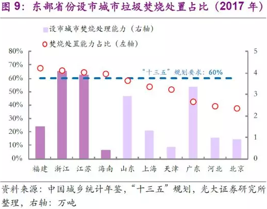 設(shè)市城市生活垃圾焚燒處理能力方面,除了全國設(shè)市城市垃圾焚燒處置能力比例達(dá)50%的要求之外,規(guī)劃中要求東部省市的設(shè)市城市垃圾焚燒處置占比需達(dá)60%以上。東部十省市中,截止2017年僅有福建、浙江、江蘇、海南等四省滿足上述要求,山東、廣東等產(chǎn)廢大省以及北京、上海等直轄市仍需進(jìn)一步提升其垃圾焚燒處理能力占比。