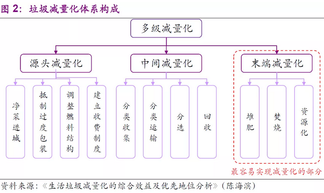 “全過程多級減量”是最適合我國可持續(xù)發(fā)展基本思想的垃圾減量化體現(xiàn)形式?!叭^程多級減量”通過從垃圾體系的源頭、中間、末端等三方面的全面控制用以實(shí)現(xiàn)減少固體廢物產(chǎn)生這一核心要素,而其中最容易優(yōu)先實(shí)現(xiàn)減量化的部分是末端的減量化。