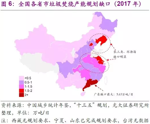 城鎮(zhèn)生活垃圾焚燒處理能力方面,根據(jù)《“十三五”全國城鎮(zhèn)生活垃圾無害化處理設(shè)施建設(shè)規(guī)劃》的要求,截止2017年,幾乎所有省市(除西藏、青海外)均存在一定的城鎮(zhèn)垃圾焚燒處理產(chǎn)能缺口。產(chǎn)廢大省之一廣東的城鎮(zhèn)垃圾焚燒產(chǎn)能缺口最大(5.63萬噸/日),江蘇、浙江、安徽、天津、北京等長三角和環(huán)渤海地區(qū)的省市在已有產(chǎn)能較多的同時也存在較大的產(chǎn)能缺口。