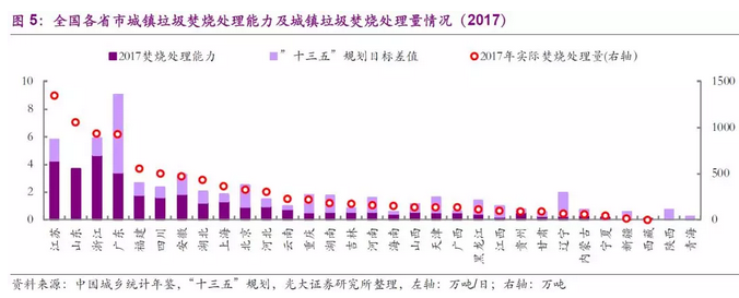 一是供需情況不同,產(chǎn)能缺口依然較大。光伏、風(fēng)電行業(yè)經(jīng)過多年的高速發(fā)展,產(chǎn)能增長遠(yuǎn)超預(yù)期,同時也已基本完成國家規(guī)劃要求;而垃圾焚燒行業(yè)目前的發(fā)展尚未完成國家“十三五”規(guī)劃的目標(biāo)(2020年設(shè)市城市生活垃圾焚燒占比50%,全國城鎮(zhèn)(設(shè)市+縣城)生活垃圾焚燒產(chǎn)能59.14萬噸/日,而2017年分別為43.84%、33.14萬噸/日)。