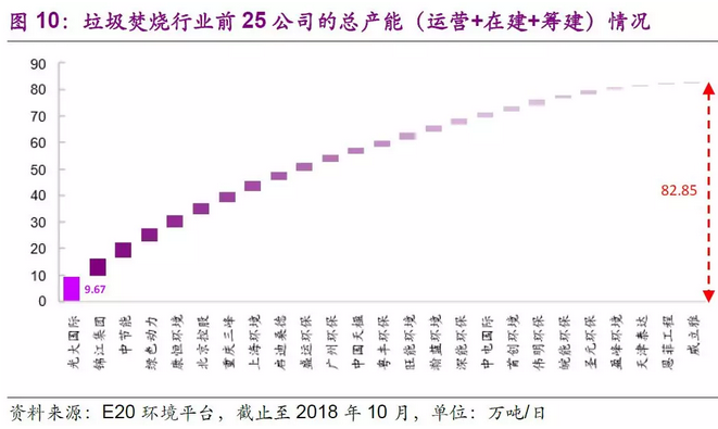 雖然目前運(yùn)營產(chǎn)能缺口仍存,但是儲備產(chǎn)能較為充足。根據(jù)E20環(huán)境平臺的統(tǒng)計,截止2018年10月,行業(yè)排名前25的公司的垃圾焚燒處理總產(chǎn)能(含運(yùn)營+在建+籌建)已達(dá)82.85萬噸/日,超規(guī)劃要求的59.14萬噸/日。