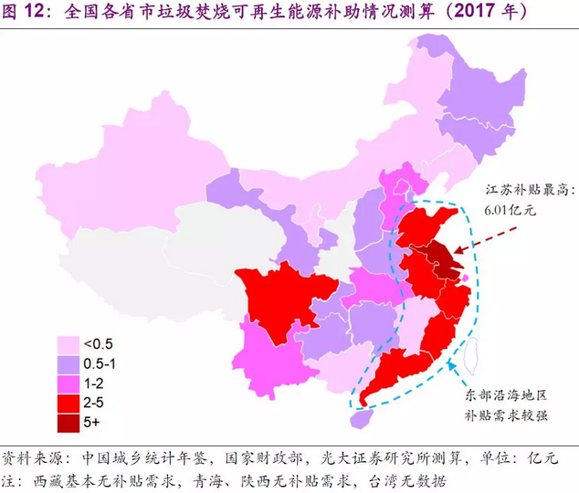 進(jìn)一步分析,垃圾焚燒產(chǎn)能充足,實(shí)際處理量較多的東部沿海地區(qū)在2017年的補(bǔ)貼需求較強(qiáng),江蘇的城鎮(zhèn)垃圾焚燒處理量居全國第一,所需補(bǔ)貼金額達(dá)6.01億元;山東、浙江、廣東、福建、安徽、四川的城鎮(zhèn)垃圾焚燒處理量位列2~7位,也是另外6個補(bǔ)貼需求超2億元的省份。