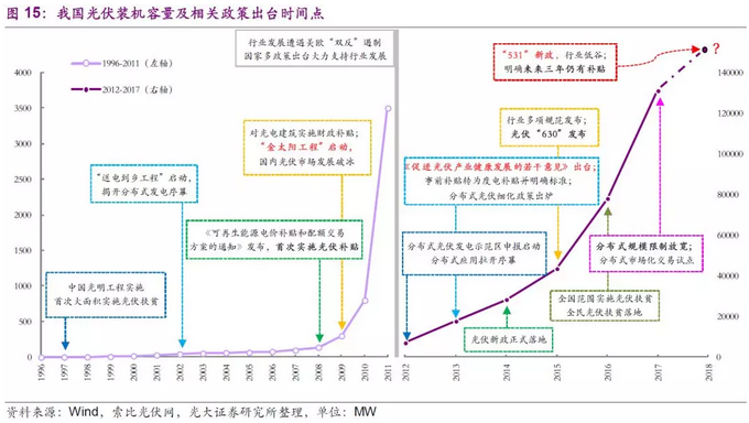和新能源汽車行業(yè)類似,我國光伏行業(yè)的高速發(fā)展同樣離不開政府政策的大力支持和財政補(bǔ)貼的持續(xù)幫助。我國光伏裝機(jī)容量的高增速起點(diǎn)便是2008年《2008年7月~12月可再生能源電價補(bǔ)貼和配額交易方案的通知》的發(fā)布,首次實(shí)施光伏補(bǔ)貼。2012年我國遭遇美歐“雙反”政策后,國家持續(xù)出臺多項政策和補(bǔ)貼細(xì)則支持光伏行業(yè)的發(fā)展,帶動我國新增光伏裝機(jī)容量自2013年起連續(xù)五年位居全球第一,2017年光伏裝機(jī)容量已達(dá)131GW(全球第一)。