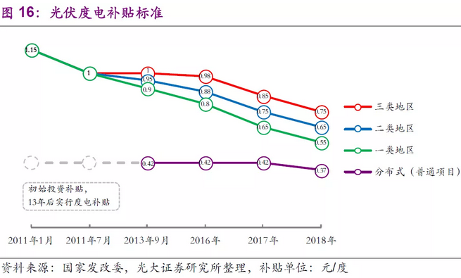 和新能源汽車補(bǔ)貼類似,光伏的補(bǔ)貼標(biāo)準(zhǔn)也隨著行業(yè)的發(fā)展逐步降低,同時也更加有針對性。不過和新能源汽車不太一樣的是,光伏行業(yè)補(bǔ)貼的針對性更多的體現(xiàn)在平衡不同地區(qū)的盈利性而非鼓勵特定區(qū)域的發(fā)展。