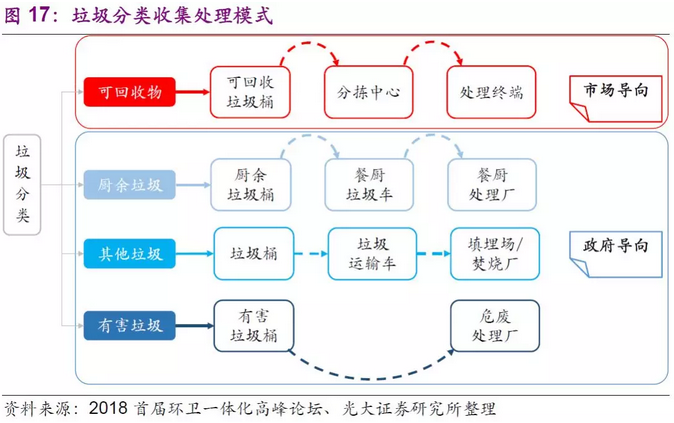 (3)收集精細(xì)化,推動再生資源行業(yè)的發(fā)展。再生資源回收利用行業(yè)原本也是政府大力推進(jìn)的固廢處理板塊,是實(shí)現(xiàn)垃圾處理“資源化”目標(biāo)的最有效手段。但是行業(yè)發(fā)展受阻的重要原因之一便是垃圾分類制度的不健全,導(dǎo)致拾荒者、黑市等現(xiàn)象頻出,行業(yè)劣質(zhì)公司騙補(bǔ)情況嚴(yán)重,導(dǎo)致行業(yè)發(fā)展緩慢。垃圾分類的全面實(shí)施可以提高前端垃圾收集的精細(xì)化程度,更能進(jìn)一步推進(jìn)再生資源和生活垃圾網(wǎng)絡(luò)的“兩網(wǎng)融合”,推動再生資源行業(yè)的發(fā)展。
