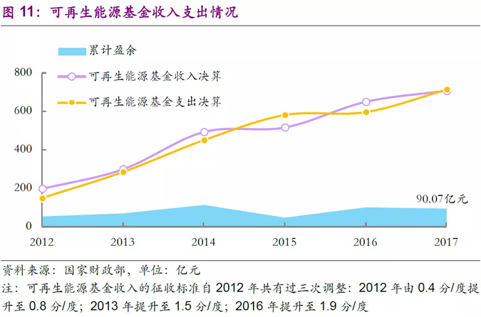 未入庫項目的一次性入庫補(bǔ)足需求同樣可以被較好消化。截止至第七批可再生能源電價附加資金補(bǔ)助目錄發(fā)布,共有189個垃圾焚燒項目納入補(bǔ)助目錄,垃圾焚燒產(chǎn)能為17.01萬噸/日,僅占2017年全部產(chǎn)能(33.14萬噸/日)的51.33%。垃圾焚燒項目入庫率相對較低的主要原因是第七批補(bǔ)助目錄的納入要求為發(fā)電項目需在2016年3月前并網(wǎng),在2016年3月-2017年新上網(wǎng)的垃圾焚燒項目不滿足申請要求,而該段時期垃圾焚燒產(chǎn)能保持了高增速。根據(jù)城鄉(xiāng)統(tǒng)計年鑒數(shù)據(jù),約4萬噸/天的城鎮(zhèn)垃圾焚燒產(chǎn)能(共1365萬噸焚燒垃圾處理量)暫時無法被納入補(bǔ)貼目錄。根據(jù)一般政府補(bǔ)助基金要求,假設(shè)上述項目在第八批(假設(shè)時間為2020年)被納入補(bǔ)貼目錄,需一次補(bǔ)足的金額(假設(shè)從2016年3月起并網(wǎng)至2020年)約為30億元。而可再生能源基金截止2017年的收入盈余為90.07億元,完全可以覆蓋該一次性支出。