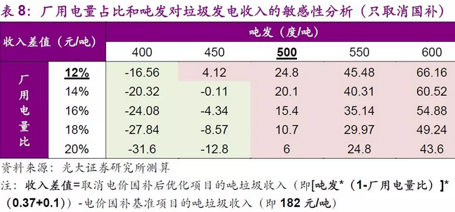 在此情景下,當(dāng)優(yōu)化項目的噸發(fā)達(dá)到500度/噸,或是廠用電量占比低于12%時,便基本可以保證優(yōu)化項目的垃圾焚燒發(fā)電收入可以覆蓋基準(zhǔn)項目電價補(bǔ)貼帶來的額外收入,優(yōu)化項目在無國補(bǔ)情況下仍然可以給公司帶來穩(wěn)定收益。